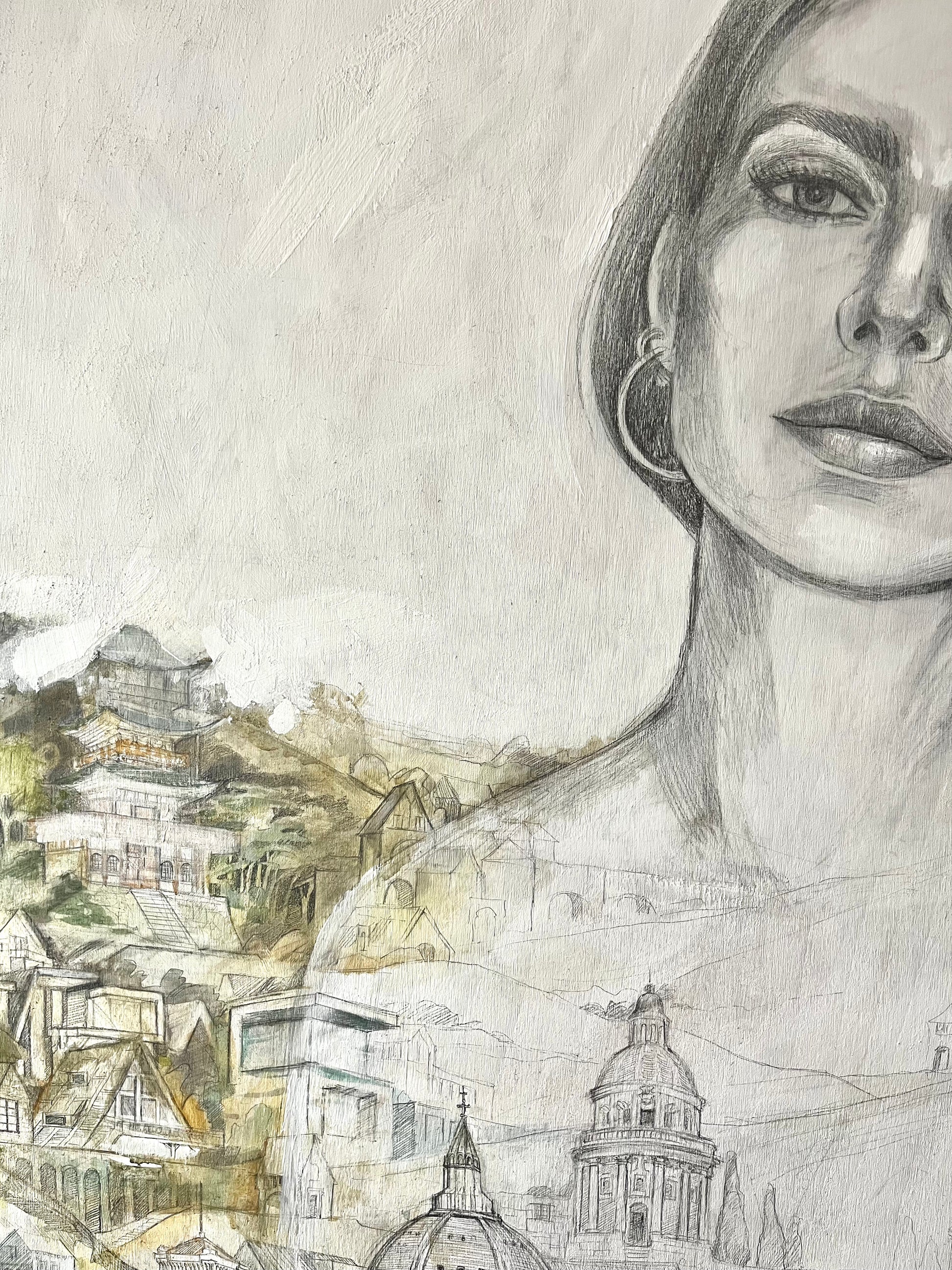 This artwork is a visual synthesis between the human portrait and the architecture of collective memory. At the center of the composition stands the figure of a woman seen from the front, with a calm and sincere expression, becoming a symbol of vulnerability and authenticity. Her features, both strong and delicate, convey the presence of an inner solidity that does not fear being exposed to the world.