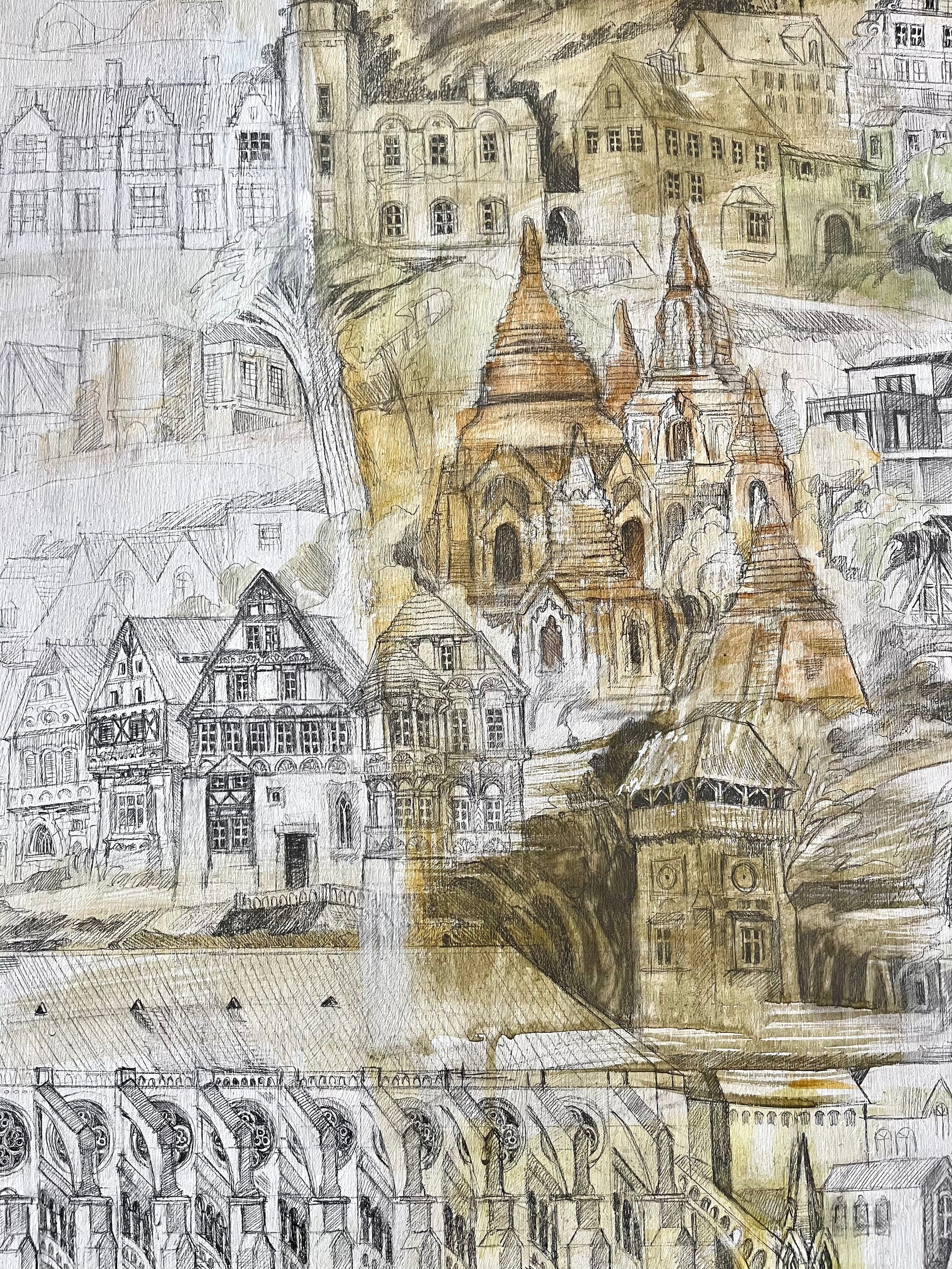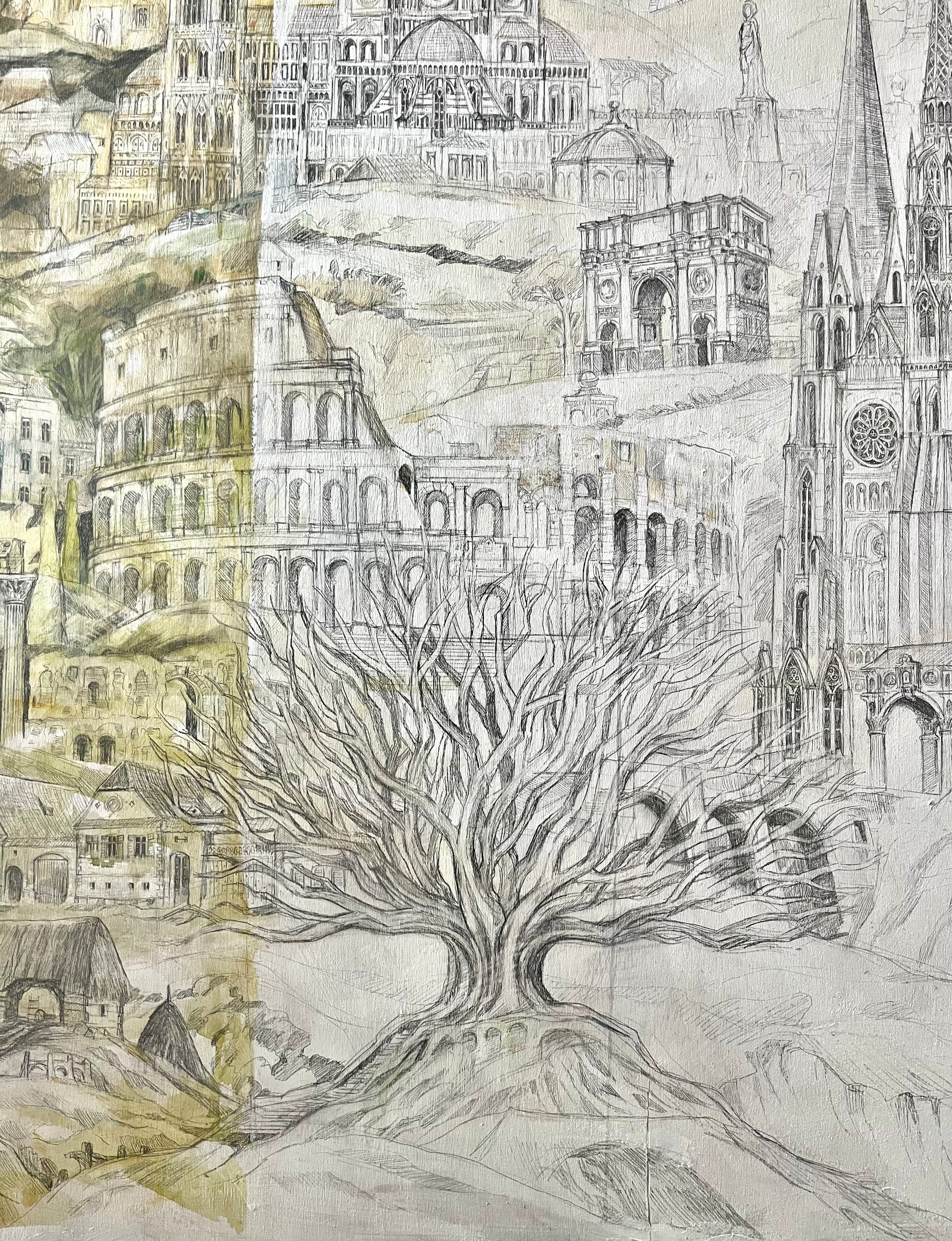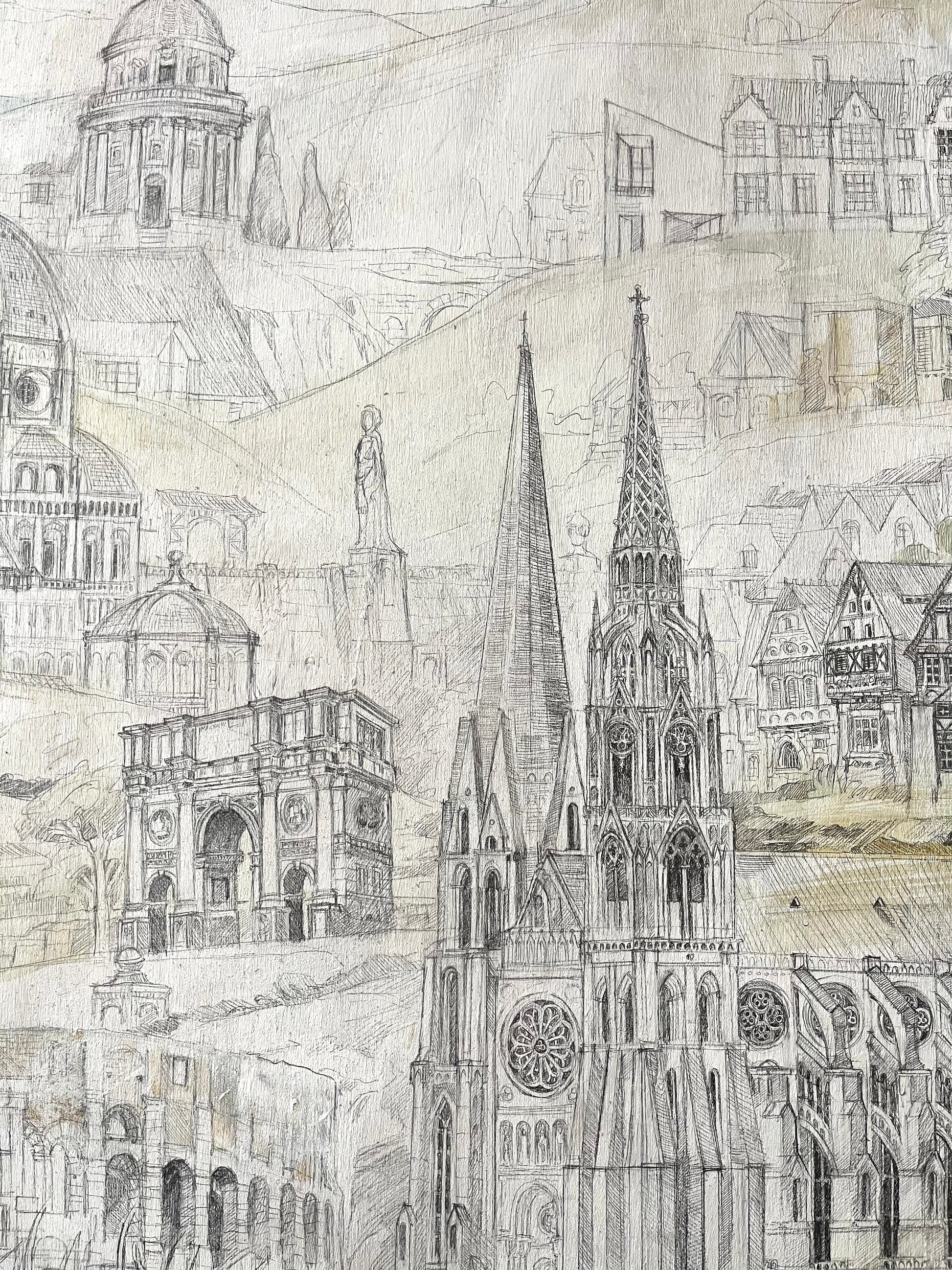 Her body dissolves into a vast landscape of cities, monuments, and iconic structures, drawn with precision and subtlety. Each building seems to represent a story, a culture, a civilization—a palimpsest of humanity. The architecture becomes a universal language, weaving together history, identity, and knowledge. The urban landscape flows organically, like a map of the inner world revealed without reservation.